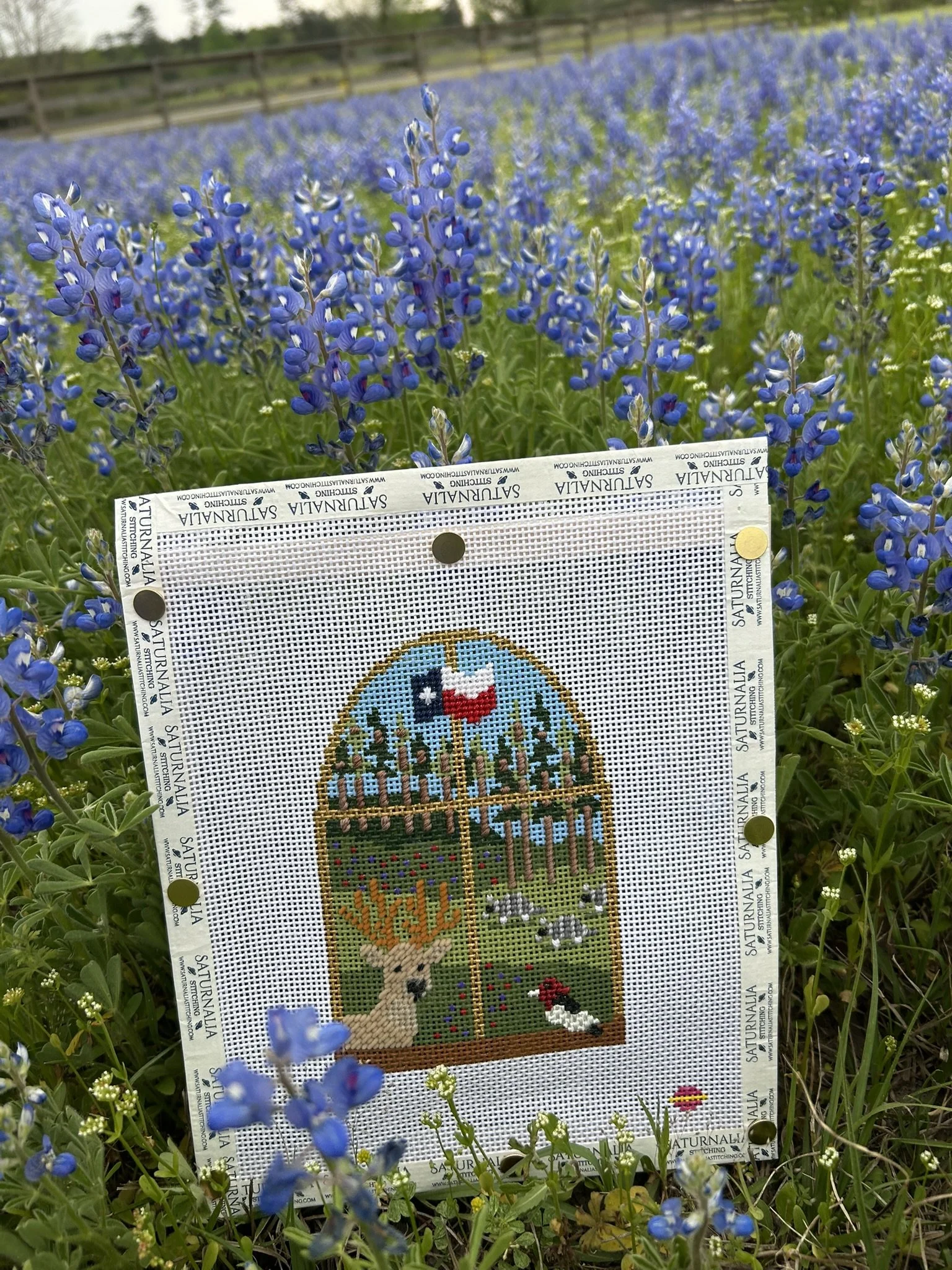 East Texas Window, White tail Buck, Red headed woodpecker, armadillo, texas flag, bluebonnets